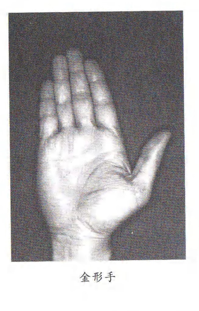 金形掌-掌形方正、指方如樑柱,不肥不瘦。此類型人原則性重、剛直、不擅通融方便、自律、責任心重,忠誠,遇困阻時能得到支持,但因較固執,人生多經磨練;仍可憑鬥志而得成就。