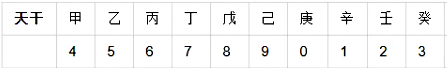 十個天干甲乙丙丁戊己庚辛壬癸,甲丙戊庚壬為陽,乙丁己辛癸為陰,甲乙五行為木、丙丁為火、戊己為土、庚辛為金、壬癸為水,陰陽五行循環輾轉相生相剋,而天干地支的原始意義是指樹幹和樹枝,歷來術家對十個天干各有解釋,而在“史記、漢書、說文解字”等古籍對天干地支都有具體解釋(不贅),若與曆算中陽曆配合計,便會看到凡是甲年必是4為尾數,乙5、丙6、丁7、戊8、己9、庚0、辛1、王2、癸3,在玄學概念中每一個天干數字都代表不同意思,甲4(陽木)萌動/開始、乙5(陰木)發芽/隨合/伸展、丙6(陽火)亮麗/旺盛、丁7(陰火)亮盛而衰、戊8(陽土)豐茂/成就、己9(陰土)坦途/衆受、庚0(陽金)歛實/成熟、辛1(陰金)秋收/轉變、壬2(陽水)懷種/新途、癸3(陰水)熟落/結束。天干看現象亦影响著每一個人,不同的年份對各人都有各自的遭遇,社會上各類名人的奮鬥、出道、決定、死亡、轉變等過程,都與天干五行表述的年份現象,有很明顯的互動關係…